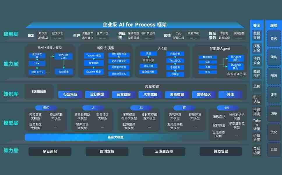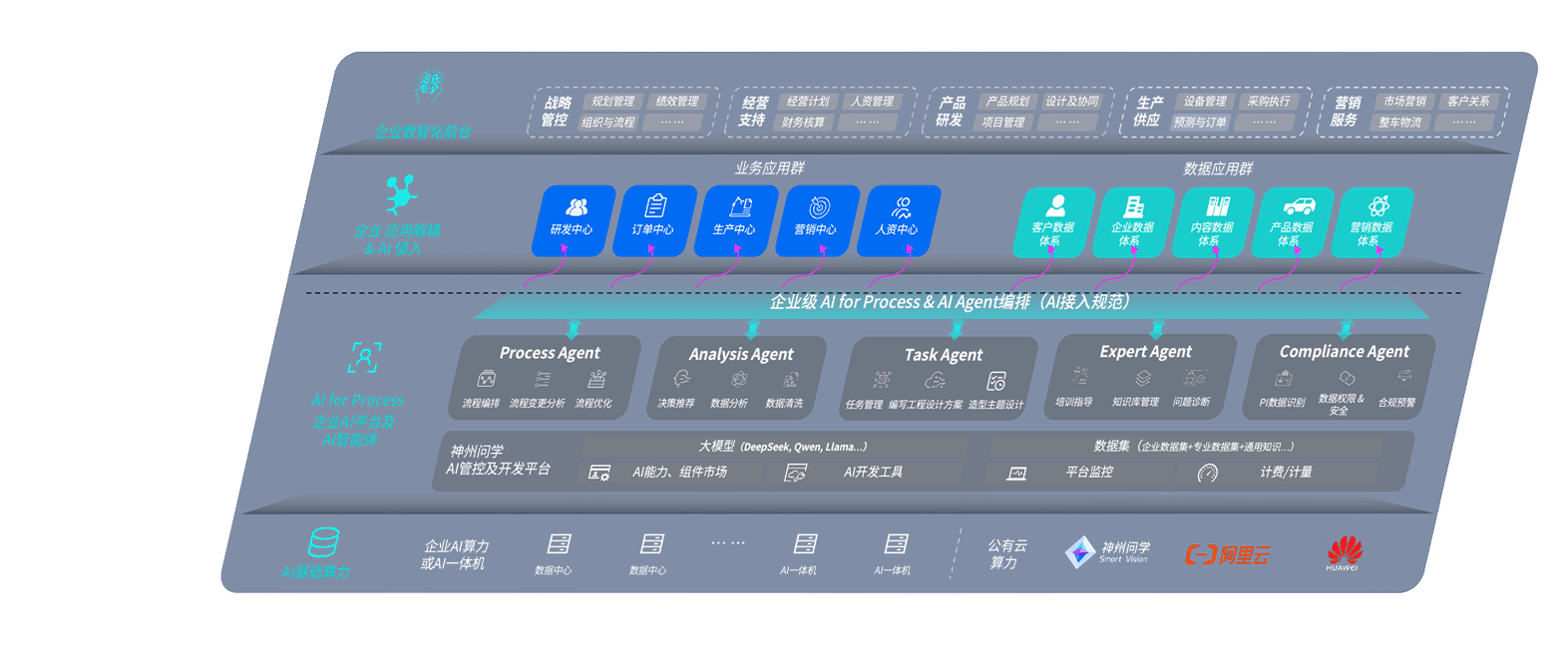 端到端的一站式AI工作空间深度融合了从企业战略规划到日常经营的全流程业务板块,,定向解决车企内部领域多、、、部门多、、链条长、、场景碎片化等难题,,支持车企快速构建以AI为核心的生产力写作体系,,,,实现任务执行与AI能力的无缝集成与交互