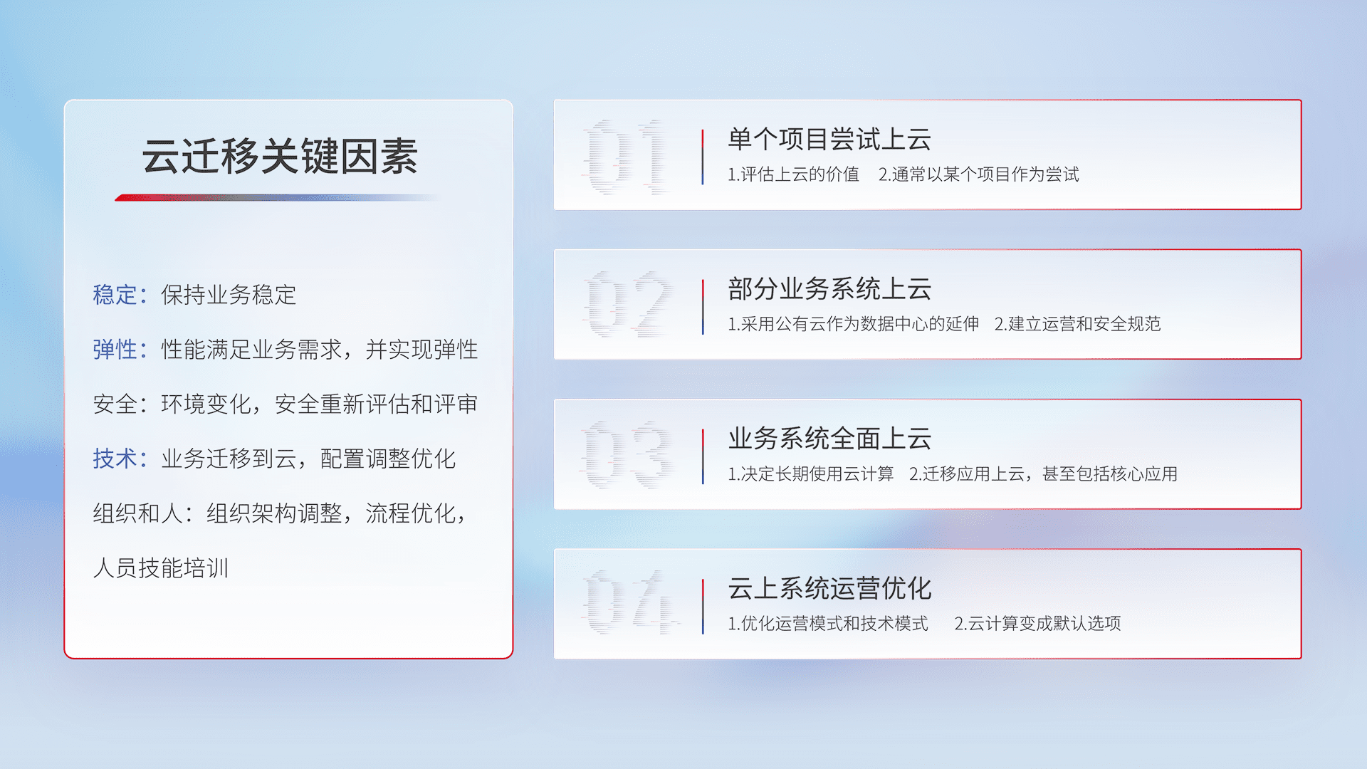 结合实际业务,,从规划设计、、、、云平台选型、、、、云原生改造、、、数据迁移、、、集成交付,,迁移全过程为客户识别最佳上云路径,,做好风险识别管理,,设计网络架构、、、身份权限、、安全审计合规、、、、操作审计、、、日志审计、、、监控告警策略、、、多站点容灾设计等,,,,对云上基础设施进行整体规划,,提升IT治理水平,,,,以满足弹性、、、高可用、、、高性能的需求。。