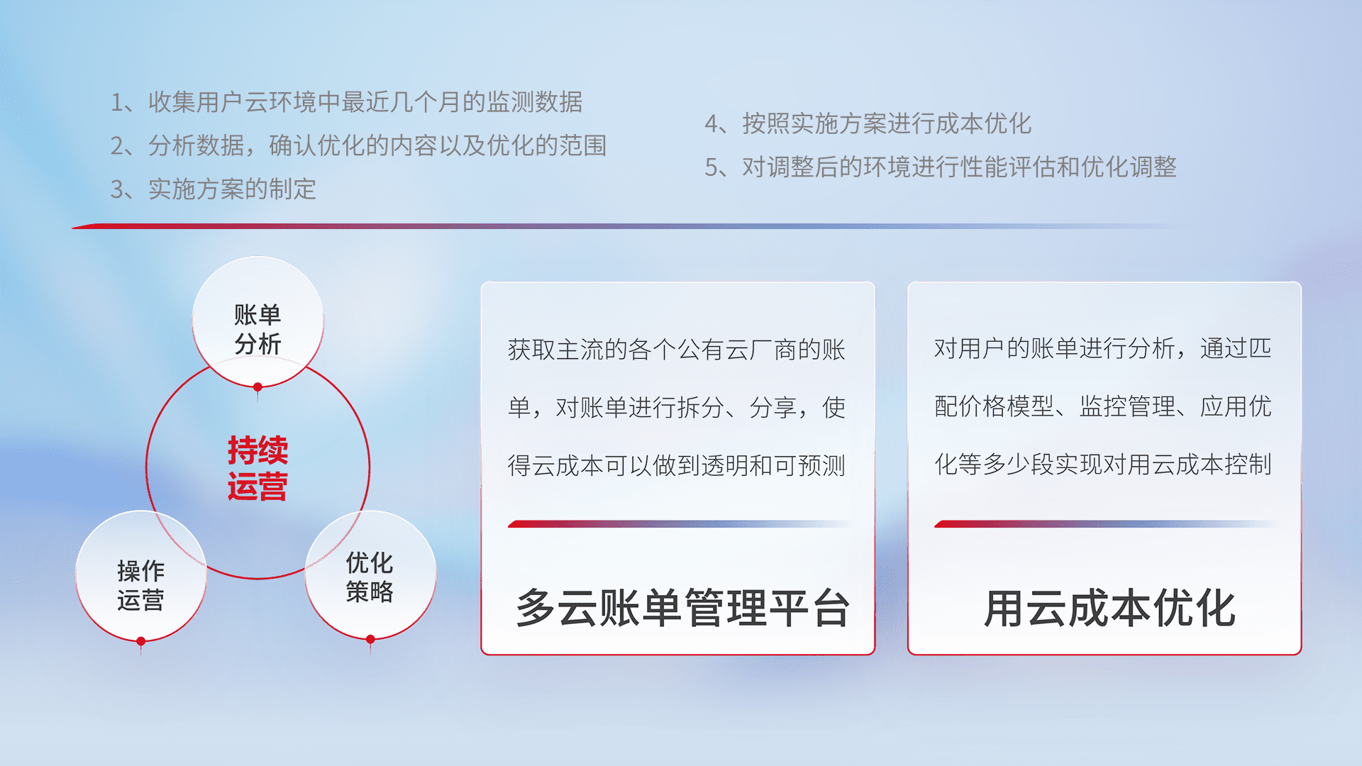 通过多云纳管,,以统一的资源数据模型把客户的云资源进行抽象和封装,,,进而实现对多云资源的统一操作,,,保障云资源管理的可靠性、、、稳定性与可用性。。。。量身定制化运维内容,,,,配置、、开发运维、、补丁管理、、备份、、监控、、认证和访问管理、、、审计和日常巡检等,,,,保障在用云过程中的可靠度,,,稳定度以及高可用率。。。